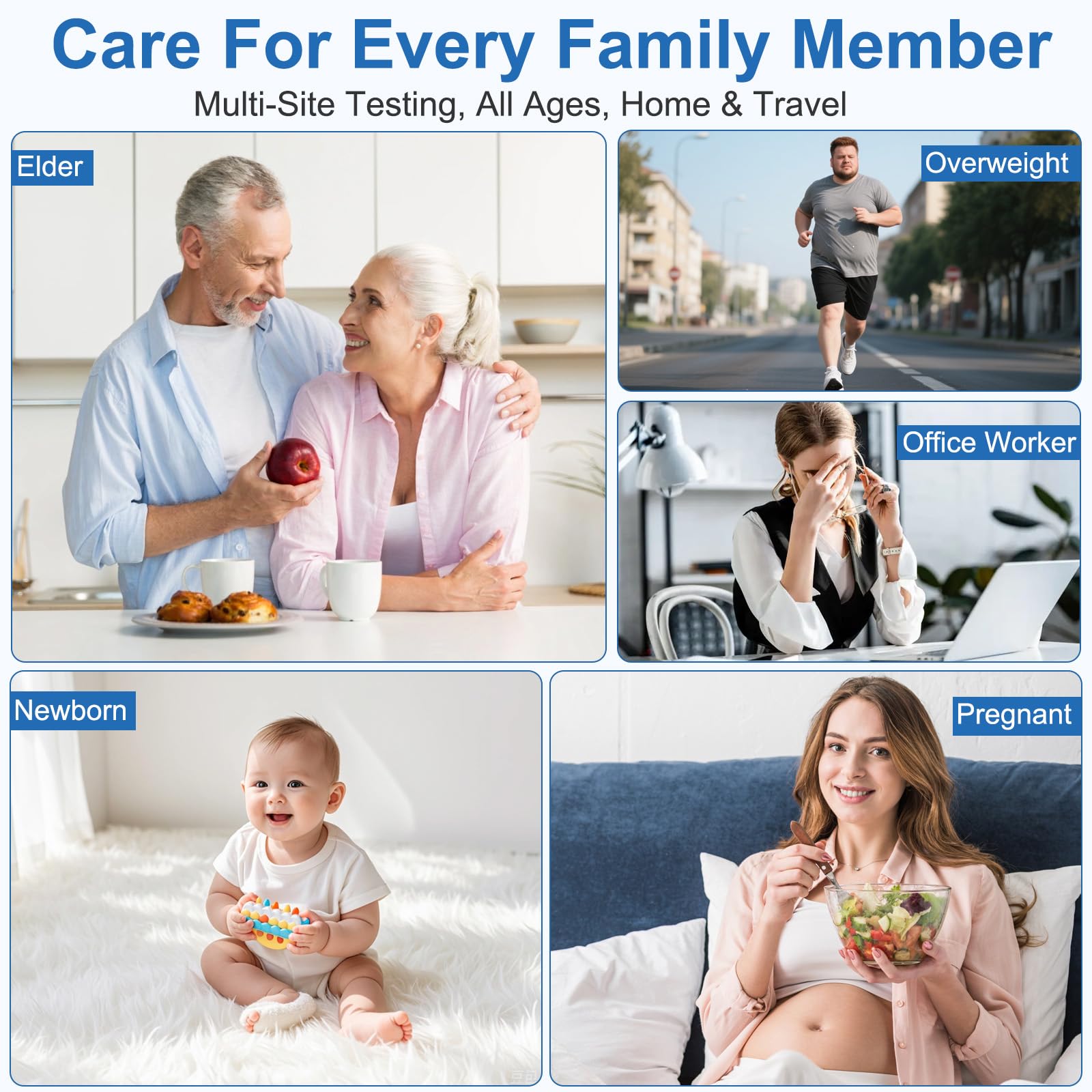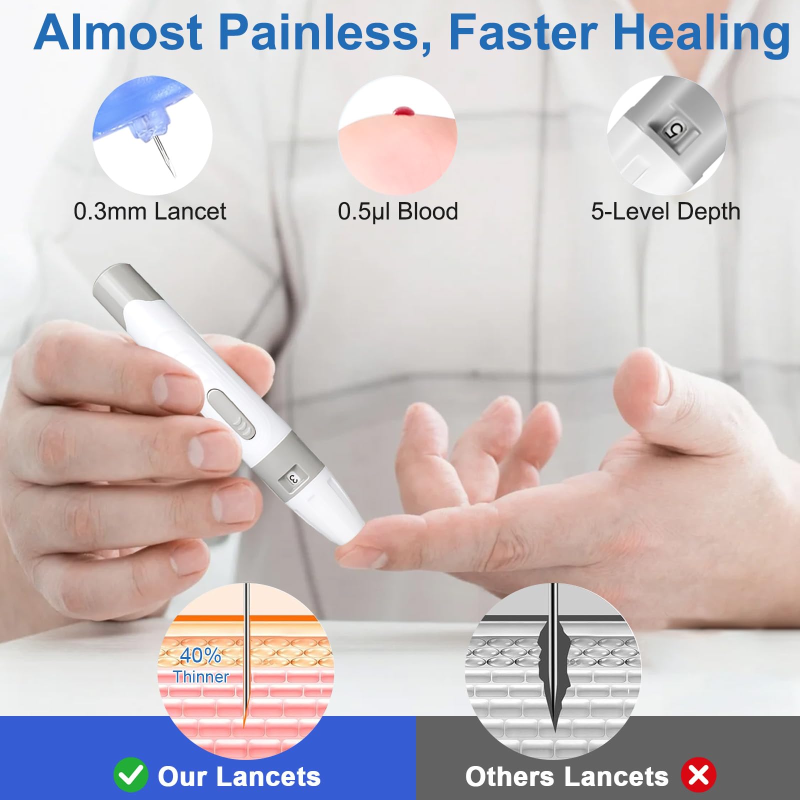 Complete blood glucose testing kit with everything you need for reliable home monitoring. Features a code-free meter with 5-second results, 100 test strips, 100 ultra-thin 33G lancets, adjustable lancing pen, and carrying case. The large LCD screen and auto-eject design make testing hygienic and effortless for all ages. Requires minimal blood (0.7μL) with ±15% accuracy. Stores up to 500 readings and includes batteries. Ideal for daily diabetes management at home or on the go.